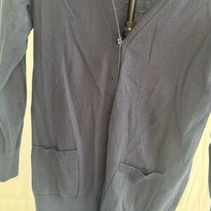 Classic deep blue cardigan. Ideal for layering. Adds sophistication to any look.