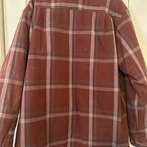Men’s large, burgundy color. Outer is 100% cotton brushed flannel, inner Sherpa.