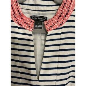 This Jessica Howard dress in size 14 features a classic blue and white striped pattern with pink crochet trim for a stylish accent. The sleeveless design and V-neckline add a touch of elegance, while the knee-length shift style is perfect for various occasions including travel, weddings, parties, and casual outings. Made of polyester, this dress is easy to care for as it is machine washable. Whether worn in the summer, fall, or spring, this dress is sure to make a fashionable statement.