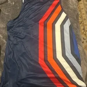 Stylish sleeveless top with bold blue and red stripes. Features a unique design with a rabbit logo.