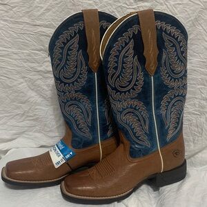 Stylish Ariat boots with intricate stitching. Rich blue and brown leather. Perfect for any occasion.