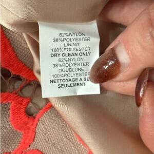 Details: Elegant Trina Turk dress featuring a floral lace overlay outlined in bright embroidery with a flattering hi-lo hem. Designed with a scoop neckline, sleeveless cut, and full lining for comfort. Finished with a concealed back zip closure. A perfect piece for weddings, garden parties, or special events. Fabric: 62% nylon, 38% polyester.