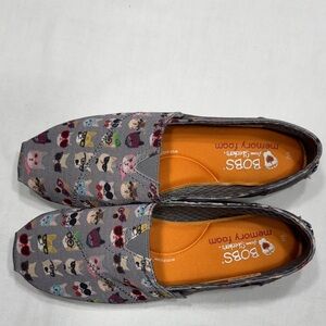 This is a preowned, in EUC, pair of BOBS for dogs canvas slip on shoes. Size 8. Very cute dog & cat pattern.