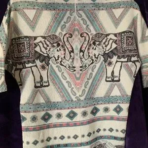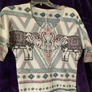 Gently used women’s Gaze Cream Sweater with Elephant Motif, short sleeve lightweight