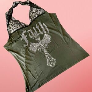 WBQ Black Stretchy Lace Halter Rhinestone Cross Gothic Sleeveless Top SzXXL