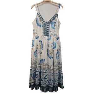 Me 2 Magic Anthropologie Sz M Blue White Gold Tiered Sleeveless Dress Sz L NWT