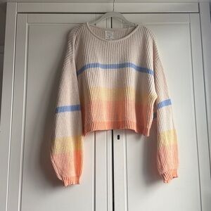Excellent conditionBillabong Changing Tides jumper sweater in cream with blue, pale, yellow, pale, orange, striped details, drop-shoulder arms, boxy, wide fit, cable knit stitching. Women’s size medium, approximate measurements below. Bundle for a discount!