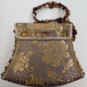 Elegant satchel with intricate beadwork. Features gold and brown tones. Perfect for a stylish touch.
