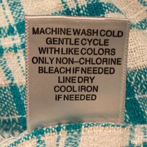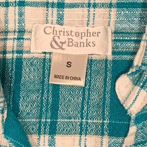 This Christopher & Banks button-up top is a must-have for any wardrobe. With a plaid pattern in multicolor teal, green, and white, it features short sleeves and a collared neckline with button closure. The linen rayon cotton blend material is lightweight, breathable, and stretchy, making it perfect for casual or business occasions in summer, fall, or spring. The top is a size small and fits regular size type. It has accents of button and features a coastal grandma, beach casual, coastal, academic, school, college, university, preppy, gossip girl, and cottagecore theme.