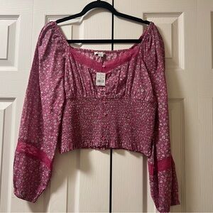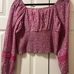 Stylish pink blouse with floral pattern. Features smocked bodice and button details. Long sleeves with lace accents.