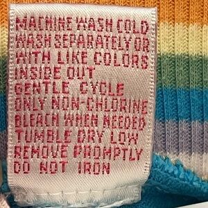 What a cute pair of Y2K Xhilaration velour sleep pants. They feature an elastic waistband, rainbow band, velour material, side pocket, and cropped length. There is a small mark on the left pant leg about midway down. (Mark is on the side without the pocket. Shown closeup, with arrow pointing it out, and length of mark. See last 3 pictures.) Otherwise, these sleep pants are in really nice condition for their age. Colors are very bright and no pilling.