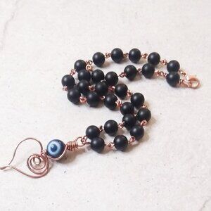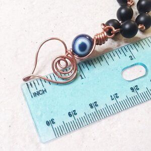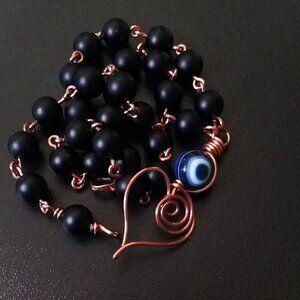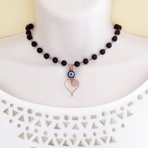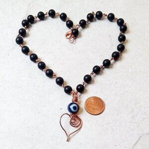 Handmade & Unique! Wire Wrapped Heart Necklace ~ Black Stone + Copper ~ Evil Eye