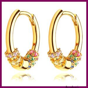 14K Gold Plated Cubic Zirconia Huggie Hoop Earrings, Chunky Round Bead Design
