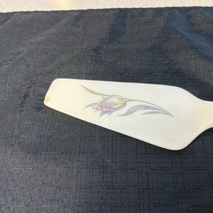 Elegant cream cake server with floral design. Perfect for serving desserts.