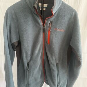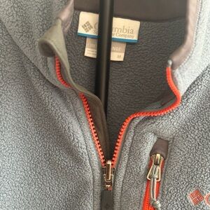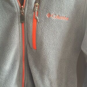 Light gray Columbia fleece jacket with vibrant orange trim. Features a full zip and convenient side pocket.