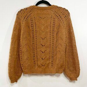 Sézane Dereck jumper cardigan featuring a v-neck, tonal metal buttons, raglan puff sleeves with fitted cuffs, slightly cropped length, openwork stitching throughout, and a mid to heavyweight mohair/wool/nylon blend yarn in an autumnal shade of cognac brown.