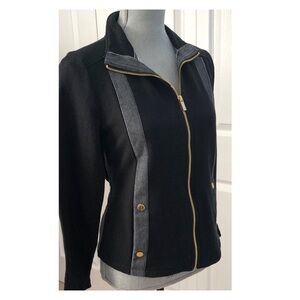 Jones New York signature jacket. Sweatshirt soft material (57% cotton/43% polyester). Black with gold detail. Two front pockets. Approx measurements are underarm to underarm 19.5”, underarm down 14”, and sleeve 23”. Sooo cute!