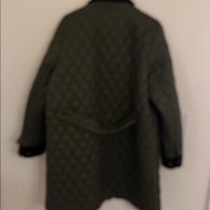 Stylish olive quilted jacket. Features black accents. Perfect for outdoor wear.
