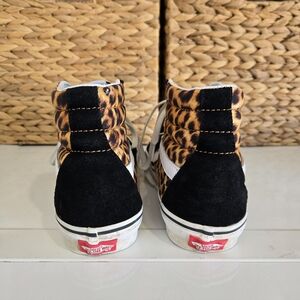 Step out in style with Vans Women's Leopard Print High-Top Sneakers. Featuring a bold leopard pattern and classic black accents, these shoes offer both comfort and flair. Perfect for making a statement.