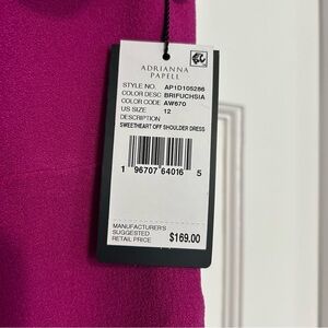 NWT size 12 bright fuchsia sweetheart neckline off the shoulder cocktail dress from Adrianna Papell. Back zipper closure.