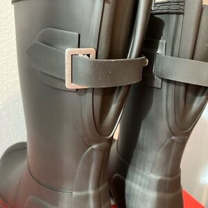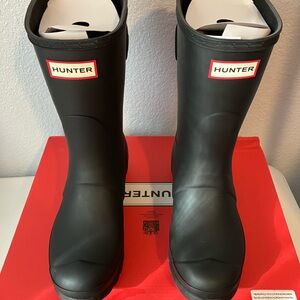 Comes with original box and packaging. Never worn, brand new. Size 6 in all Black with iconic Hunter logo.