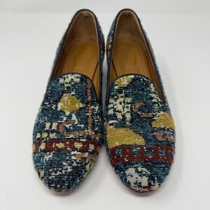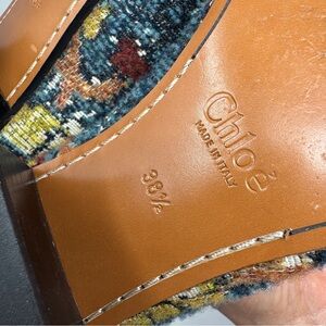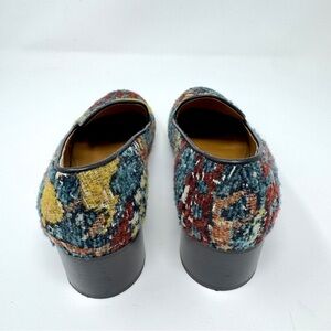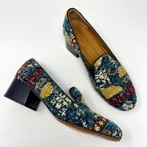 Step into bohemian luxury with these stunning Chloé tapestry loafers. Featuring a rich, intricate woven textile upper, these shoes perfectly capture the Maison’s signature Parisian chic and carefree spirit. The vibrant, southwestern looking pattern in teal, mustard, and deep red makes these a true statement piece for any curated wardrobe.