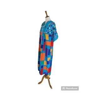 New without tag. KEYLOUN 70's Multi-color Geometric Patio Maxi Dress. Zipper front. White tie neck. Short flutter sleeves. White piping. 100% cotton. Side pocket. Oversized