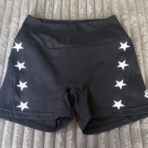 Darc Sport athletic shorts in black with white star detailing along the sides. Size small. These are from one of Darc Sport’s soft, smooth performance fabric styles with a back seam (not scrunch) and a flattering, sculpting fit.