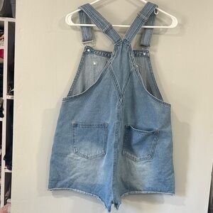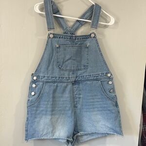 Stylish denim blue jean shorts overalls perfect for casual outings. Features a classic design with adjustable straps and front pocket. Ideal for a trendy, laid-back look. Size L