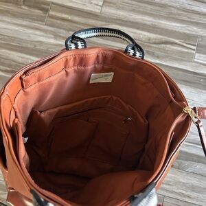 Stylish brown backpack with front zipper pocket. Features striped handles for easy carrying. Perfect for everyday use.