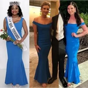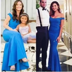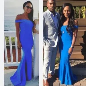 This brilliant cobalt La Petite Robe di Chiara Boni gown features an elegant off-the-shoulder neckline. Make it even more elegant with a statement necklace.
