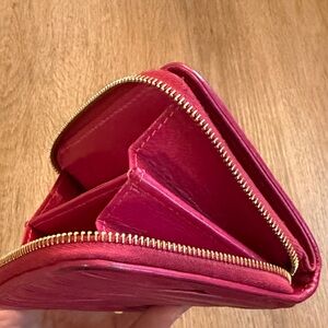 Chic fuchsia leather wallet by Miu Miu. Features elegant quilted design. Compact and stylish. Minor discoloration but no scratches or other wear. See photos. Fun classic wallet.