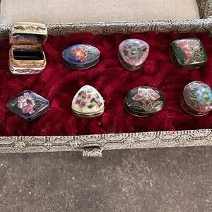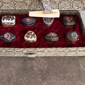 Vintage Smithsonian Institution Cloisonne Trinket Pill Boxes In Original Case Very nice for your collection. In very nice condition. All boxes open and shut perfectly. In a case.