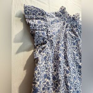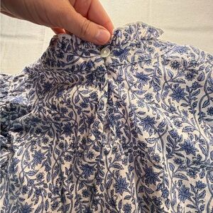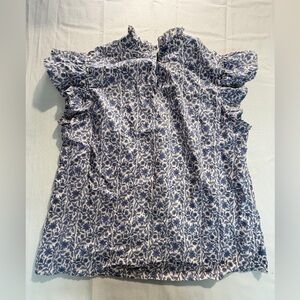 THML Blue White Floral Block Print Ruffle Sleeve Mock Neck Blouse Sz M Preppy