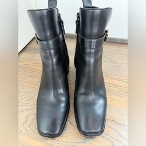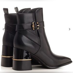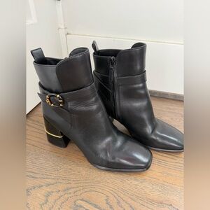 Tory Burch Black Leather Ankle Boots with Logo Buckle and gold accent EUC size 9