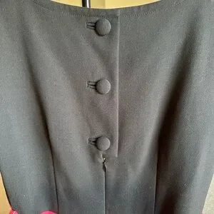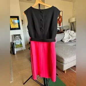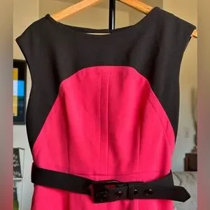 Chic, retro dress with a vibrant pink & black color blocking. Features a tonal black belt and vintage-style covered buttons. Excellent condition.