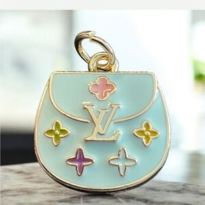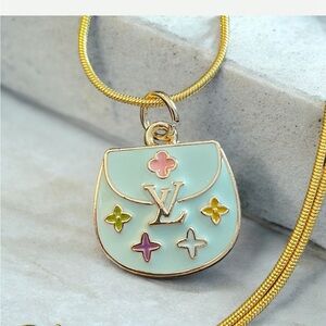 Chic LV charm with vibrant enamel. Features gold, pink, green, and purple accents. Stamped pull charm comes with a nwot 18k gold plated 18” snake chain with lobster clasp.
