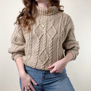 Stunning vintage Aran style cable-knit turtleneck neck by Planet. A gorgeous detailed knit pattern with ribbing on the hem & braiding effects made in a light brown tan taupe ecru color. This is the perfect cozy sweater for fall & winter! Looks great tucked into a pair of high-waisted jeans, worn with a simple midi skirt, or dressed up with a pair of straight leg trousers. Guaranteed to get so many compliments whenever you wear this piece!