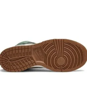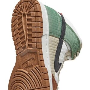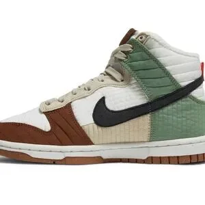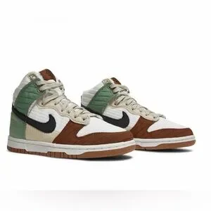High-top sneakers with green, brown, and white panels. Black swoosh detail. Comfortable and stylish.