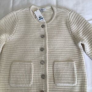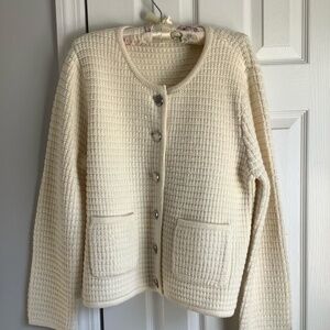 NWT Calvin Klein size XL knit sweater. Beautiful classic lines, button front , flat front pockets. Soft cream color, a perfect neutral color, preppy classic design. Could be worn as a jacket or sweater with jeans and boots or dressed up. Versatile classic cardigan soft and a great addition to your wardrobe. Retail $139