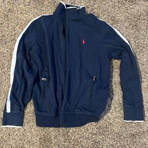Navy blue Polo track jacket with white stripes on the sleeves & red Polo logo • NOTE: zipper is broken • Size: Large • ideal for school, sporting events & casual outings • Make me an offer