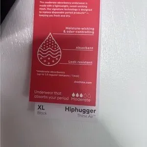 Brand new with tags Thinx Air™ Hiphugger period underwear in classic black. Designed with lightweight, breathable mesh and moderate absorbency for all-day comfort and confidence.