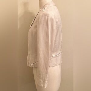 White House Black Market Cream Long Sleeve Criss Cross Open Moto Jacket has criss cross detail on shoulders, hemline. Lined on inside, linen blend.