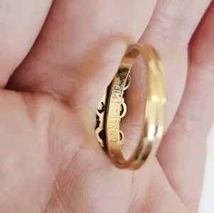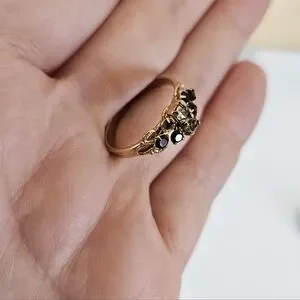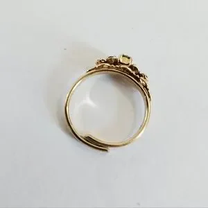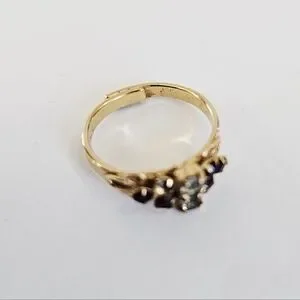 Vintage rhinestone ring from Sarah Coventry. Features small dark red rhinestones around two slightly larger icy clear rhinestones. All stones are prong set in a gold tone setting. It is adjustable style and signed on the interior. Made in a cluster setting with small decorative gold accents. This is Victorian revival style likely from the 1950's or 1960's. There is one small red rhinestone missing but it is otherwise in very good vintage condition.