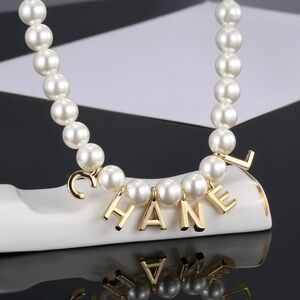 Chic CHANEL necklace with glossy white pearls and gold accents. Ideal for elevating any ensemble.