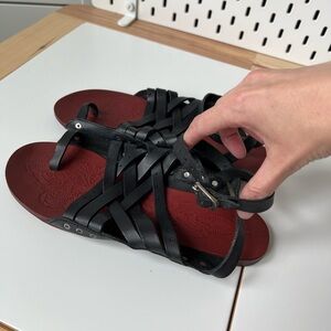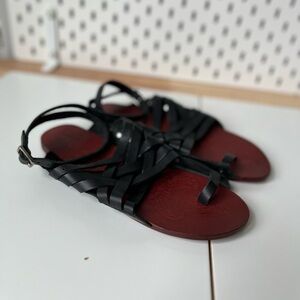 Black leather strappy sandals with an ankle strap featuring striking red soles. Ideal for versatile styling. New with tags, never worn!