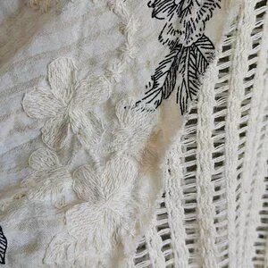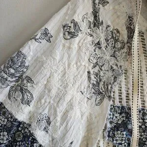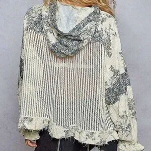 Details: It has a hooded design with a drawstring, button-up front, and a frayed or distressed hem. It also features chest pockets and balloon sleeves with intricate floral embroidery.