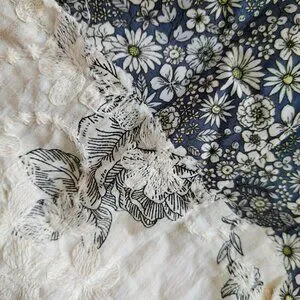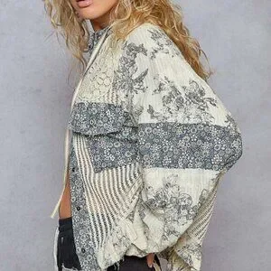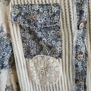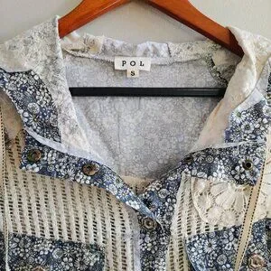 POL brand patchwork jacket. It features a unique bohemian aesthetic with a mix of floral print, lace panels, and textured woven fabric.