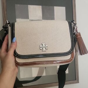 Chic Tory Burch crossbody in beige and brown. Features elegant tassel detail.