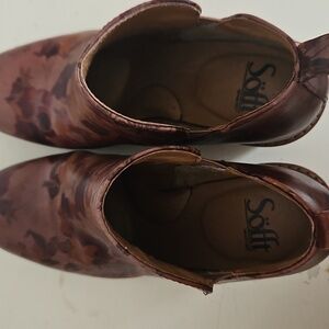 Sofft Sacora Ankle Boots Booties 7 Women's Italian Leather Brown Floral Print Wedge Heel Chelsea Slip-on Boho Western Modern Prep Statement Calf Hair Print GUC Casual Comfort Fall Winter Spring Trendy Vibe Capsule Wardrobe
